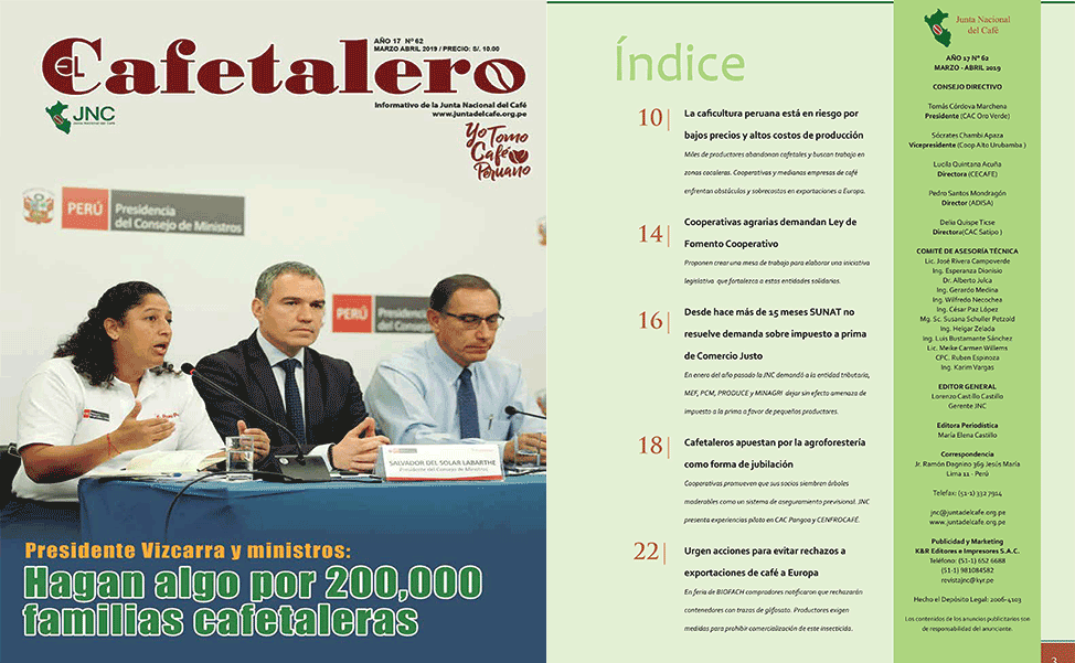Ya salió a la venta la revista «ElCafetalero» Edición Nº 62 ÍNDICE 10| La caficultura peruana está en riesgo por bajos precios y altos costos de producción Miles de productores abandonan cafetales y buscan trabajo en zonas cocaleras. Cooperativas y medianas empresas de café enfrentan obstáculos y sobrecostos en exportaciones a Europa. 14|Cooperativas agrarias demandan […]