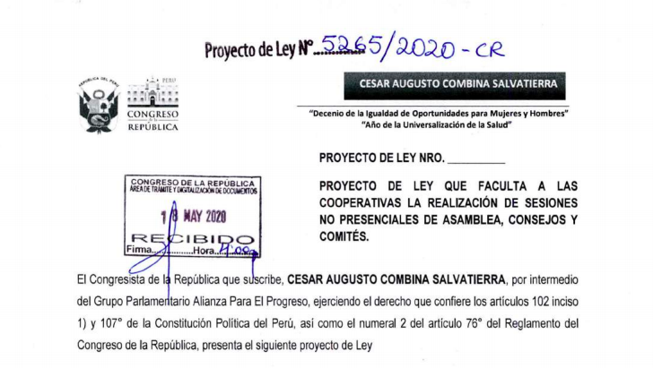 El Congresista Cesar Combina, Presidente de la Comisión de Producción, MyPE y Cooperativas del Congreso de la República del Perú, atendiendo los pedidos formulado, ha presentado el Proyecto de Ley Nº 5265-2020-CR Descargar Proyecto de ley