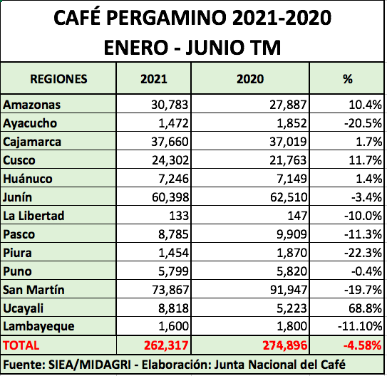 Dijo que MIDAGRI reporta una cosecha de 261 mil toneladas de café pergamino, contra 274 mil del año 2020, para el período enero/junio, volumen que representa el 70% de la producción, y que el 30% se recogen en los meses de julio a diciembre. “Hasta junio tenemos una caída de -4.7% en la recolección de granos. Posiblemente hasta fin de año se incremente. Además, debemos señalar que estas cifras oficiales de café pergamino están infladas. En café verde podríamos llegar a 250,000 TM, equivalentes a 290,000 TM de café pergamino. Estamos lejos de las 335 mil TM de café verde que cosechamos el 2011. Hasta en estadísticas estamos mal”, señaló el presidente de la JNC.
