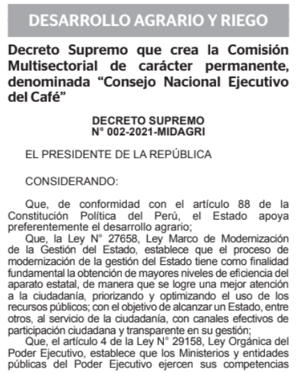 A través del Decreto Supremo N° 002-2021-Midagri, el Poder Ejecutivo creará la Comisión Multisectorial de carácter permanente, denominada “Consejo Nacional Ejecutivo del Café”, dependiente del Ministerio de Desarrollo Agrario y Riego (Midagri),