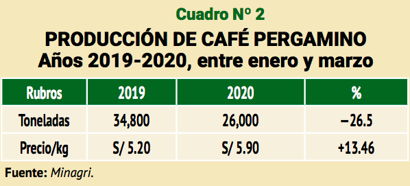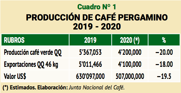 — Anualmente la cosecha de café se concentra entre los meses de marzo-julio. Por los problemas conocidos, se estima una caída en volumen de 20% respecto al 2019 (ver cuadro Nº 1).