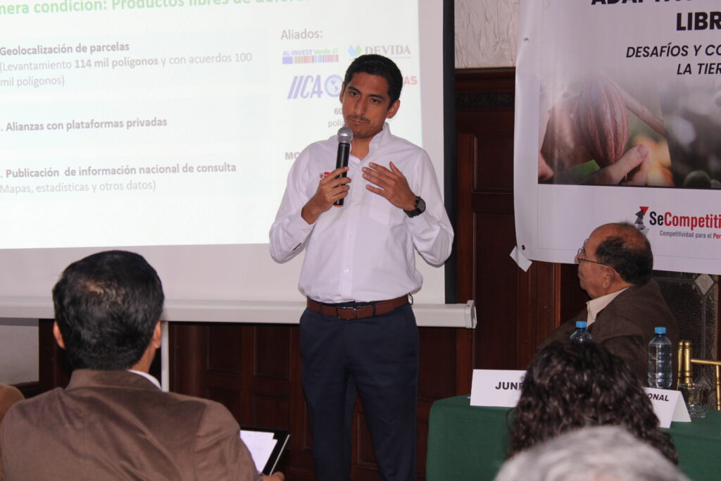 Asimismo, contó con la participación del Ing. Kleber Cruz García, Jefe Compras de Café – GEPA Alemania, quien nos brindó las «Percepciones y recomendaciones de importadores europeos sobre pronta aplicación de EDUR a productos peruanos», el Econ. Carlos Ynga La Plata, Director de la Dirección de Estudios Económicos – MIDAGRI, nos brindó las acciones compartidas de autoridades gubernamentales y sector privado para implementación de EUDR y el Ing. Marco Arce Ramírez, Director de DIGESPACR – MIDAGRI, quien compartió la información acerca de la «Titulación de tierras en la Amazonía peruana al 2030 – Programa en desarrollo».