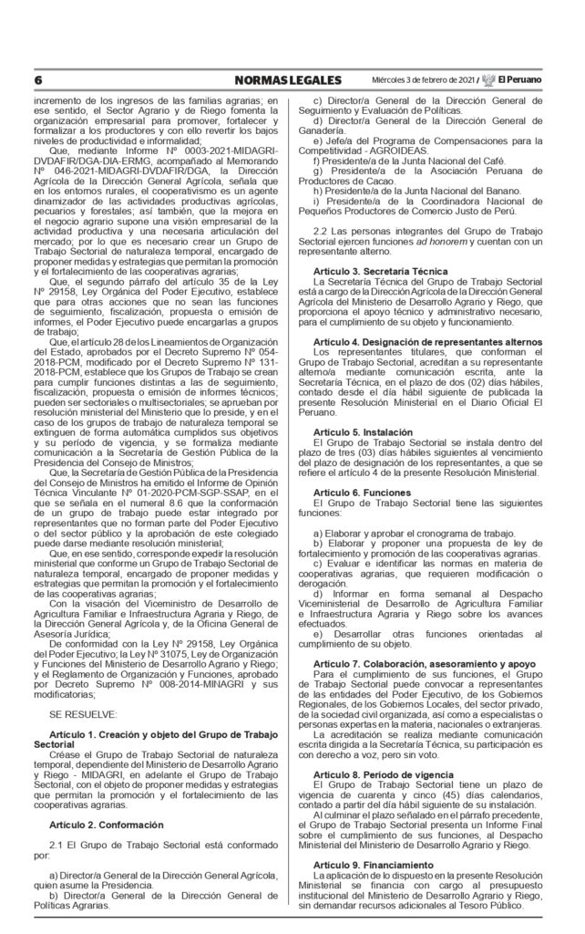 Créase el Grupo de Trabajo Sectorial de naturaleza temporal, dependiente del Ministerio de Desarrollo Agrario y Riego – MIDAGRI, en adelante el Grupo de Trabajo Sectorial, con el objeto de proponer medidas y estrategias que permitan la promoción y el fortalecimiento de las cooperativas agrarias.