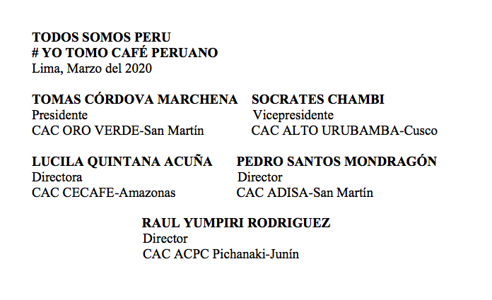 6.- Exigimos la inmediata reactivación del Consejo Nacional del Café, dotándolo de roles ejecutivos y fondos operativos, a fin de reactivar la caficultura peruana, y de esta manera acabar con la caótica gestión pública en la promoción del café, que anualmente se estima se malgastan más de 200 millones de soles en los diversos niveles de gobierno (nacional, regional y local), según presupuestos reportados en el MEF.