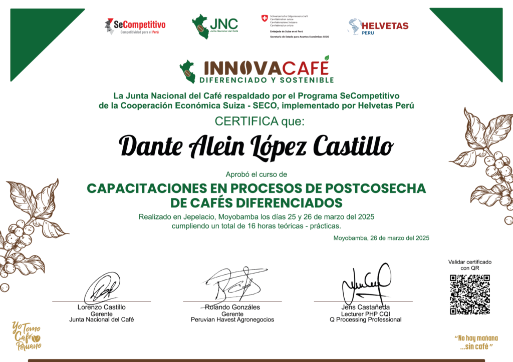 Recuerda que cuando finalices el taller de Capacitaciones en Procesos de Postcosecha de Cafés Diferenciados, de haber aprobado, podrás descargar tu certificado digital.